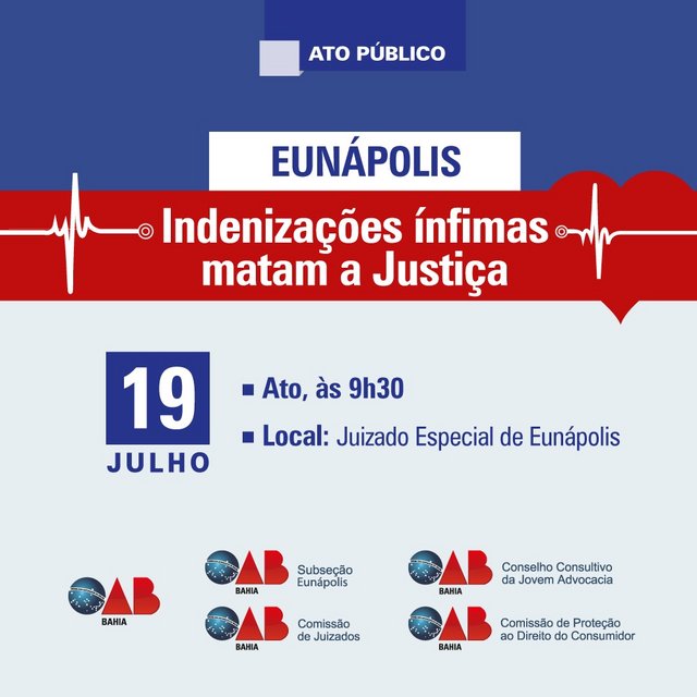 A Ordem dos Advogados do Brasil – Seção Bahia e Subseção Eunápolis, realizará um ato de mobilização da advocacia contra as indenizações ínfimas no âmbito do Juizado Especial da comarca de Eunápolis.