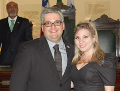 Em seguida foi realizada a leitura do compromisso, feita por Vivian Vasconcelos dos Reis Santos, que tirou a nota mais alta no Exame de Ordem, e entregue as carteiras aos novos advogados pelos componentes da alta mesa, composta também pelo Vice-Presidente da OAB-BA, Antônio Menezes, o Secretário Geral Nei Viana, o Secretário Adjunto André Godinho, o Diretor Tesoureiro Ary Moreira, o membro do Tribunal de Ética e Disciplina, Manoel de Souza Dias, o Presidente da CAAB, David Bellas, o Conselheiro Seccional Sérgio Paiva, o Vereador Geraldo Junior, a Professora Lorena Brandão Portela, os advogados Élbio Palmeira e Jairo Andrade de Miranda, a advogada e ex-Conselheira Analice Spínola, representando as mães, e dona Ivone de Carvalho Oliveira, representando os avós dos novos advogados.