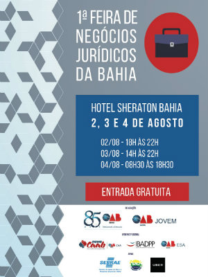Informações e inscrições: www.oab-ba.org.br/encontro-regional Será realizada simultaneamente ao 2º Encontro Regional da Jovem Advocacia do Nordeste, de forma inovadora na região Nordeste, a 1ª Feira de Negócios Jurídicos da Bahia, com estandes de empresas que prestam serviços e vendem produtos de interesse dos advogados.
