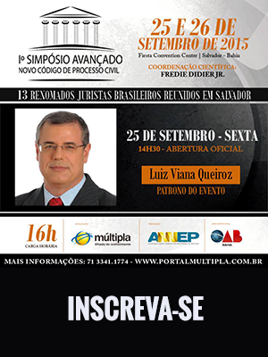 Na próxima sexta e sábado, 25 e 26 de setembro, será realizado em Salvador o 1º Simpósio Avançado sobre o Novo Código de Processo Civil, que tem apoio institucional da OAB-BA. O presidente da OAB da Bahia, Luiz Viana Queiroz, é o patrono do evento, que acontece no Fiesta Convention Center, no Itaigara, e participará da mesa de abertura, às 14h30. O conselheiro federal da OAB pela Bahia Fredie Didier Jr, revisor do projeto do novo CPC na Câmara Federal, é coordenador científico e palestrante. Advogados associados à OAB tem 10% de desconto em cima do valor profissional e os alunos matriculados nos cursos da Escola Superior de Advocacia Orlando Gomes (ESA-BA) contam com 50% de desconto na inscrição para o simpósio.