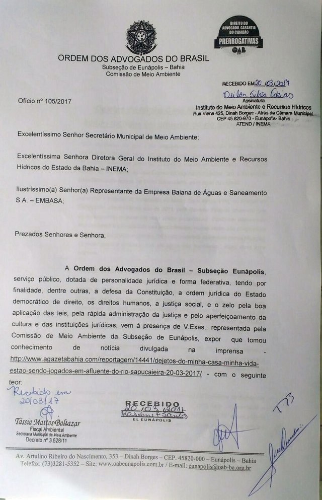 Logo após divulgação da referida matéria, com exposição detalhadas de fotos, a Comissão de Defesa do Meio Ambiente da OAB – Subseção Eunápolis, cumprindo sua função institucional, expediu Ofícios cobrando providências imediatas da Secretaria Municipal de Meio Ambiente; do INEMA e Embasa acerca da denúncia de poluição em afluente do rio Sapucaeira.