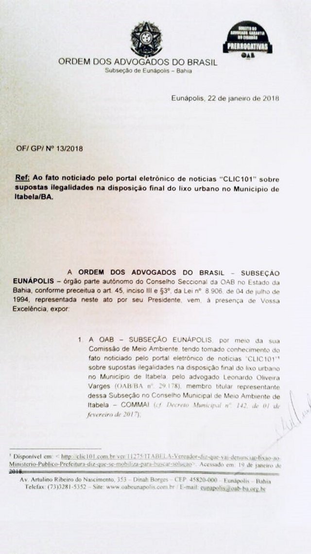 Logo após divulgação da referida matéria, com exposição detalhadas de fotos, a Comissão do Meio Ambiente da OAB/Eunápolis, cumprindo sua função institucional em defesa do meio ambiente, expediu Ofício nº 13/2018 cobrando providências imediatas ao Secretário Municipal do Meio Ambiente de Itabela diante do fato noticiado de acondicionamento inadequado do lixo urbano de Itabela.