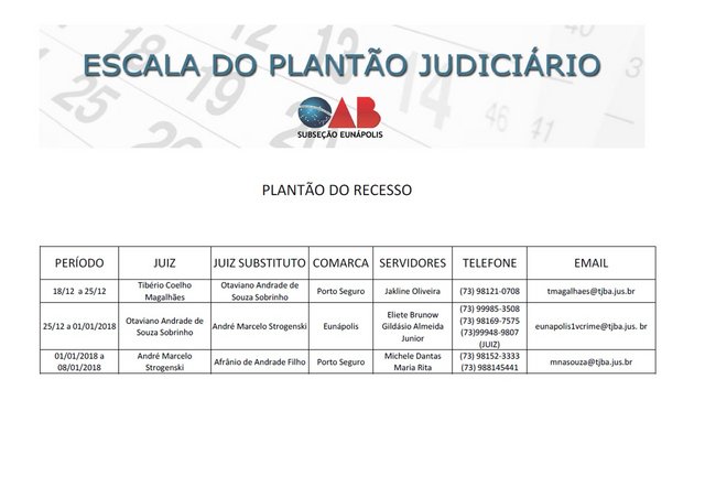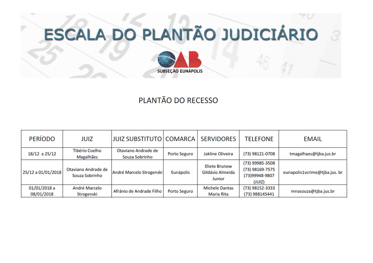 OAB/EUNÁPOLIS: A Escala de Plantão Judiciário foi extraído do site do TJ/BA