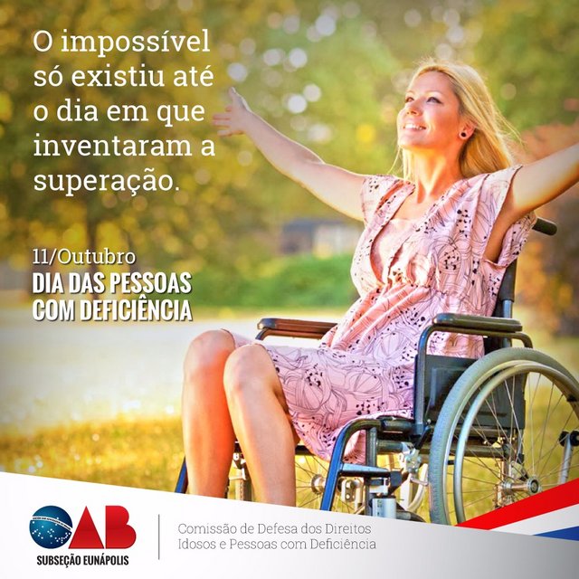 A OAB - Subseção Eunápolis, por meio da Comissão de Defesa dos Direitos do Idoso e das Pessoas com Deficiência, faz alusão ao Dia Nacional das Pessoas com Deficiência (11/10) como data marcante na história, com o objetivo de rediscutir ações efetivas voltadas para este segmento da população.