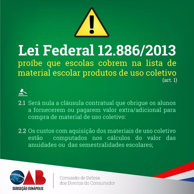 A Comissão de Defesa do Consumidor da OAB - Subseção Eunápolis lança campanha informativa revestida de interesse público com o objetivo de alertar os cidadãos sobre os direitos dos consumidores na hora de efetuar matrículas e na aquisição do material escolar.