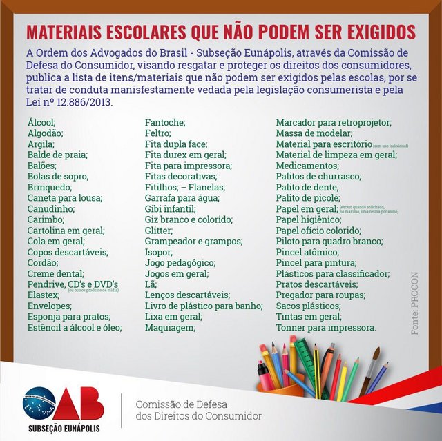 A OAB - Subseção Eunápolis divulga itens proibidos na lista de material escolar