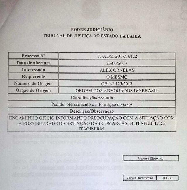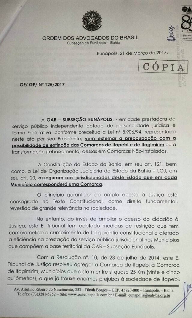 Na tarde de quinta-feira (23/03), o Presidente da OAB – Subseção Eunápolis (Alex Ornelas) acompanhado do Secretário Geral da OAB – Seção BAHIA (Carlos Medaur) estiveram reunidos com a Assessora Especial da Presidencia de Assuntos Institucionais do TJ/BA (Marielza Brandão Franco), momento em que foi protocolizado Ofício nº 125/2017, externando antecipadamente a preocupação institucional com eventual ato do TJ/BA que determine a extinção/ desativação das comarcas de Itapebi e Itagimirim.