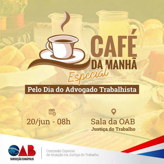 Na manhã do dia 20 de junho (terça-feira), em comemoração ao Dia do Advogado Trabalhista, será realizado um café da manhã na sala da OAB da Justiça do Trabalho – Eunápolis para os advogados trabalhistas.