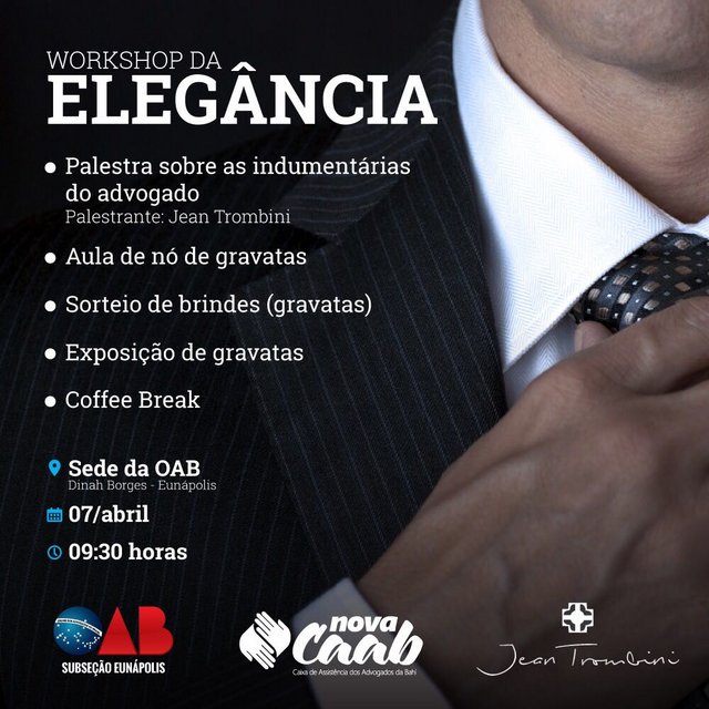 No dia 07/04 (sexta-feira), ocorrerá evento “Workshop da Elegância” na sede da OAB – Subseção Eunápolis na qual terá palestra sobre as indumentárias do advogado no contexto da formalidade da profissão; aula de nó de gravatas; sorteio de gravatas para os participantes e exposição de gravatas da marca Jean Trombini.