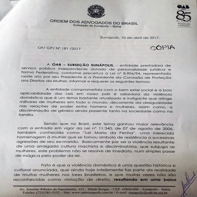 Na manhã de quinta-feira (20/04), representantes da Comissão de Proteção aos Direitos da Mulher da OAB - Subseção Eunápolis expediram Ofício n. 181/2017 e foi protocolizado na Governadoria do Estado da Bahia solicitando a criação da DEAM - Delegacia Especializada de Atendimento à Mulher na cidade de Eunápolis.