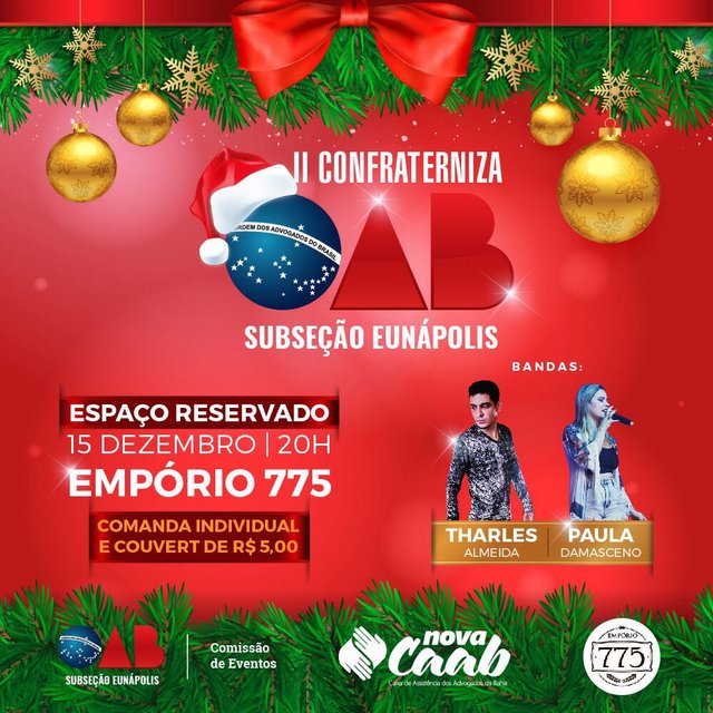 OAB - Subseção Eunápolis, através da Comissão de Eventos e Cultura, promoverá a segunda Edição do “Confraterniza OAB”, no dia 15 de Dezembro (sexta-feira), a partir das 20 horas, com a apresentação dos cantores: Tharles Almeida e Paula Damasceno.