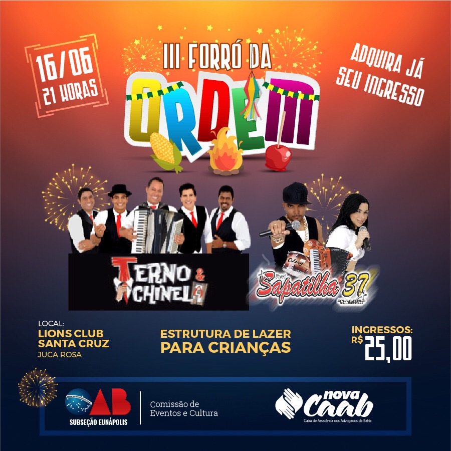 No dia 16/06, será realizada terceira edição do evento junino promovida pela Comissão de Eventos da OAB denominado "III Forró da Ordem", espaço do Lions Club, em Eunápolis.