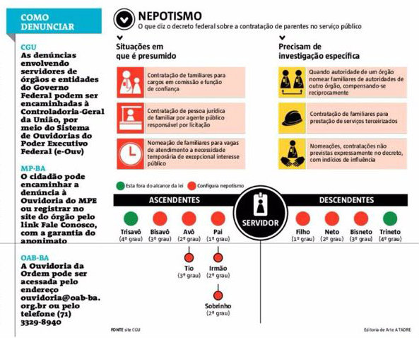 Em 2016, mais de 65 municípios baianos receberam recomendações para exonerar parentes até o terceiro grau, de prefeitos, vice-prefeitos, secretários municipais e de vereadores, ocupando cargos comissionados ou funções de confiança nos órgãos públicos.