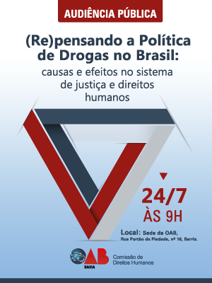 A OAB da Bahia, através da sua Comissão de Direitos Humanos, promove a audiência pública “Repensando a Política de Drogas no Brasil: causas e efeitos no sistema de justiça e direitos humanos”. O evento acontece nesta sexta-feira (24/07), a partir das 9h, na sede da entidade, na Rua Portão da Piedade.