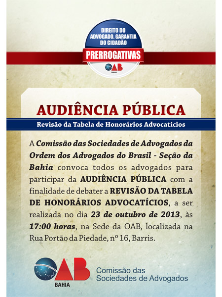 Local: Auditório da OAB da Bahia, Rua Portão da Piedade, nº 16, Barris. A Comissão das Sociedades de Advogados da OAB da Bahia convoca os advogados baianos para participar da Audiência Pública com a finalidade de debater a Revisão da Tabela de Honorários Advocatícios. O evento acontece no dia 23 de outubro, às 17h, na sede da OAB, na Rua Portão da Piedade, nº 16, Barris. A audiência será transmitida ao vivo pela internet no site da Ordem em www.oab-ba.org.br.