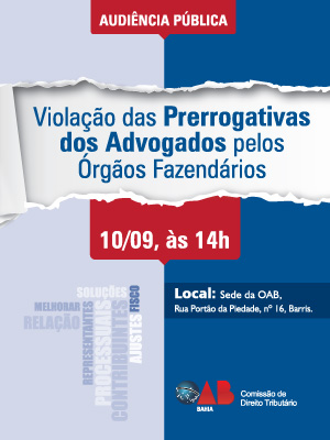 Local: Sede da OAB da Bahia A audiência pública "Violação das Prerrogativas dos Advogados pelos Órgãos Fazendários" é promovida pela Comissão de Direito Tributário da OAB da Bahia.