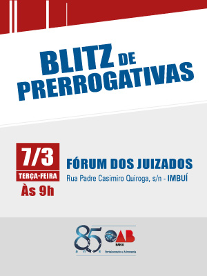 Local: Fórum dos Juizados, Rua Padre Casimiro Quiroga, no Imbuí. Nesta terça-feira (7/3), às 9h, a OAB da Bahia promove Blitz de Prerrogativas no Fórum dos Juizados, no Imbuí. Será a segunda edição do evento, em prol das prerrogativas profissionais da advocacia, que começou em janeiro na Justiça do Trabalho, no Comércio. Participe!