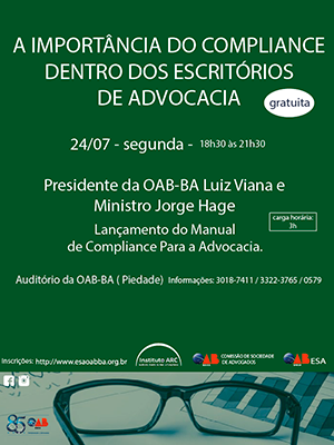A aula inaugural do curso, com o tema “A Importância do Compliance dentro dos Escritórios de Advocacia”, é gratuita e acontece na próxima segunda-feira (24), às 18h30, no auditório da OAB da Bahia, na Rua Portão da Piedade, com o presidente da OAB-BA, Luiz Viana Queiroz, e o ex-ministro da Controladoria-Geral da União, Jorge Hage, discorrendo sobre a importância de programas preventivos de integridade e autorregulação dentro dos escritórios de advocacia para prevenir a prática de ilícitos. Na ocasião, será lançado o Manual de Compliance para a Advocacia, da OAB da Bahia. Inscrições: https://goo.gl/G7v6Mv