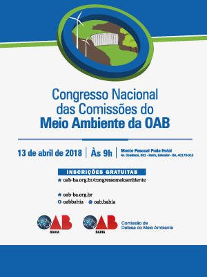 A seccional Bahia da Ordem dos Advogados do Brasil sediará no dia 13 de abril o Congresso Nacional de Comissões do Meio Ambiente da OAB. O evento acontecerá durante todo o dia, das 9h às 20h, no Monte Pascoal Praia Hotel, na Barra, e contará com 16 painéis que abordarão temas diversos, como Desastres Ambientais com Barragens de Rejeitos e o Princípio da Prevenção, e Meio Ambiente Sustentável como Direito Fundamental.