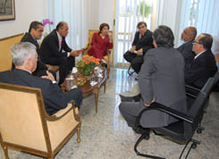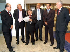 O Conselheiro do CNJ Jefferson Luis Kravchychyn e a Diretoria da Seccional estiveram na tarde desta quinta-feira, 18, com a Presidente do Tribunal de Justiça da Bahia, Desembargadora Telma Brito. Em visita à cidade para uma palestra promovida pelo IAPE (Instituto dos Advogados Previdenciários), o Conselheiro fez questão de conhecer a Presidente e dialogar sobre os problemas que afligem o Poder Judiciário baiano. Para o Presidente da OAB-BA, Saul Quadros, foi uma retomada das negociações sobre o assunto. Participaram também do encontro o Vice-Presidente da Seccional, Antônio Menezes, o Diretor Tesoureiro, Ary Moreira, o Secretário Geral, Nei Viana, o Conselheiro e Presidente da Comissão de Relações Institucionais da OAB-BA, Sylvio Garcez, e o Presidente do IAPE-BA, Marcos Barroso.