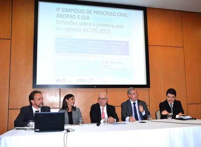 Com discussões acaloradas, foi encerrado o 1º Simpósio de Processo Civil, promovido pela OAB da Bahia, por meio da Escola Superior de Advocacia Orlando Gomes (ESA-BA), e Associação Brasileira de Direito Processual Civil (ABDPRO). Realizado no auditório do Salvador Trade Center, na Av. Tancredo Neves, entre os dias 24 e 26 de maio, o evento reuniu estudantes e profissionais em torno das reflexões sobre o primeiro ano de vigência do novo Código de Processo Civil (CPC).“Este foi um simpósio que agradou em cheio pela sua metodologia, uma vez que viabilizou o diálogo entre os participantes. Sem dúvida nenhuma, temos que reproduzir eventos desta natureza, que são de uma riqueza extraordinária. Saio daqui muito feliz”, destacou o presidente da OAB-BA, Luiz Viana Queiroz.
