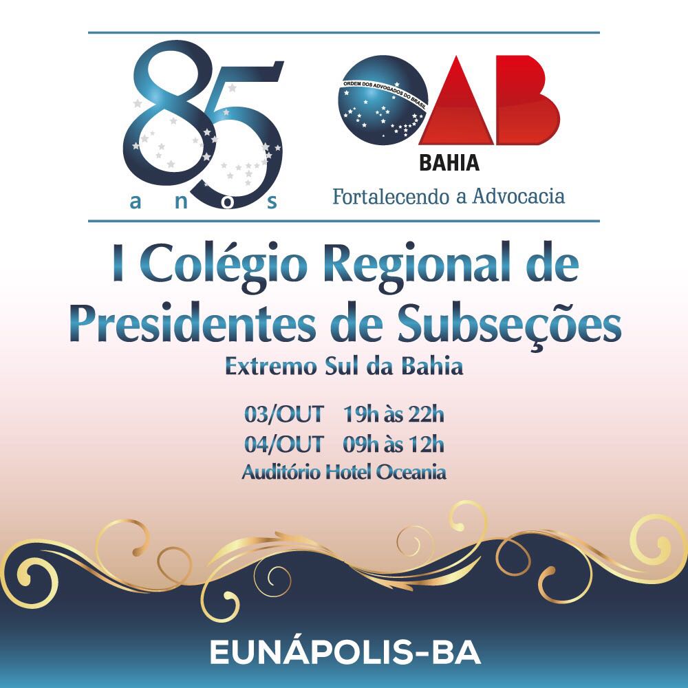 Nos dias 03 e 04 de outubro, será realizado “I Colégio de Presidentes Regional do Extremo Sul da Bahia” com objetivo de diagnosticar os principais problemas relacionados ao exercício da advocacia, bem como traçar planejamento de ações/proposições que buscam o fortalecimento da advocacia regional.