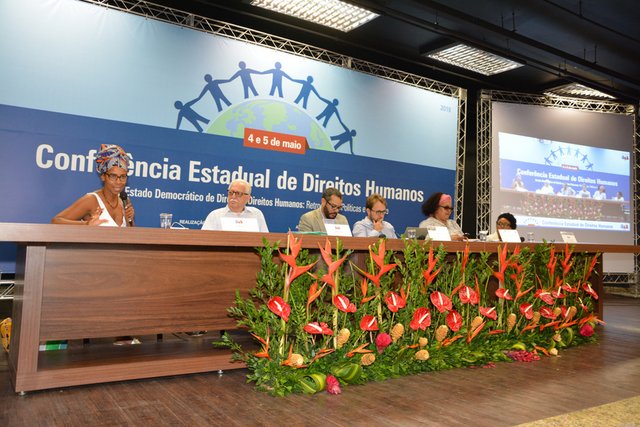 A conferência tratou também dos problemas relativos à segurança pública e dignidade da pessoa humana. Participaram da mesa a professora Marília Muricy, a defensora pública Vilma Reis e a procuradora do estado Maristela Barbosa. De acordo com Maristela Barbosa, o país está vivendo um momento de retrocessos. "O que me ocorre neste momento é que parece haver um problema de falta de memória e falta de estudo de história", afirmou. Ela destacou ainda que são as lutas sociais que conquistam os Direitos Humanos e que o modo de produção capitalista contribui bastante para os problemas de violência da nossa sociedade. "Essa questão da segurança pública e da onda de violência, sem sombra de dúvida, estão atreladas ao capitalismo". A professora Marília Muricy criticou o atual sistema prisional que, segundo ela, tem como principal função fortalecer o preconceito em relação à minoria negra. "Como disse Focault, a prisão é um instrumento ótico para estigmatizar as minorias e afirmar a superioridade da maioria sã, como parte saudável da sociedade". Ao se apresentar, a defensora pública Vilma Reis fez questão de afirmar seu nome e sobrenome e ressaltou que esta é uma prática de resistência, sobretudo para aquelas populações que historicamente são oprimidas. "Em uma sociedade racista, organizada pelo pacto secular do patriarcado, em uma sociedade pautada na desigualdade por conta da orientação sexual, do pertencimento territorial e religioso, nós mulheres negras precisamos ter nome e sobrenome. Senão o racismo, o sexismo, a LGBTfobia e outras formas de opressão botam o nome que quiser na gente". Foto: Angelino de Jesus (OAB-BA)