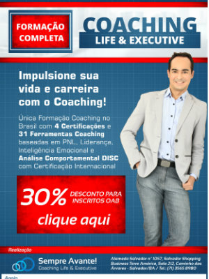 Inscrições: www.sempreavante.com.br Pela segunda vez a OAB da Bahia, por meio da Escola Superior de Advocacia Orlando Gomes (ESA/BA) apoia a Sempre Avante Coaching Life & Executive em mais uma turma de Formação em Caoching em Salvador. Serão 8 dias de formação presencial a partir do dia 12/05 e mais de 31 ferramentas de coaching para que os participantes possam aumentar sua performance no trabalho e na vida pessoal. Pelo coaching será possível aprender como: