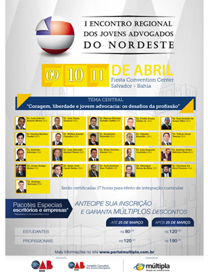 Tema Central: Coragem, liberdade e jovem advocacia : os desafios da profissão. De 9 a 11 de abril, Salvador sedia o I Encontro Regional dos Jovens Advogados do Nordeste, promovido pelo Conselho Consultivo dos Jovens Advogados da OAB da Bahia, em parceria com as comissões dos jovens advogados de todas as seccionais da OAB da região. O evento acontece no Fiesta Convention Center, na Av. Antônio Carlos Magalhães, Pituba, r tem como tema "Coragem, liberdade e jovem advocacia: os desafios da profissão". O objetivo é proporcionar uma visão mais abrangente de sua atuação profissional, apresentando novas perspectivas para o mercado de trabalho em discussões sobre temais atuais e debates com palestrantes de renome nacional.