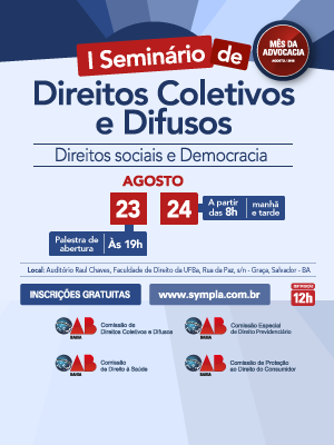 A OAB da Bahia promove nos dias 23 e 24 de agosto, próximas quinta e sexta-feira, o I Seminário de Direitos Coletivos e Difusos, com o tema Direitos Sociais e Democracia. O evento acontece no Auditório Raul Chaves, da Faculdade de Direito da UFBA, e é iniciativa da Comissão de Direitos Coletivos e Difusos, da Comissão Especial de Direito Previdenciário, da Comissão de Direito à Saúde e da Comissão de Proteção ao Direito do Consumidor. As inscrições são gratuitas e devem ser feitas no Sympla. Programação do I Seminário de Direitos Coletivos e Difusos