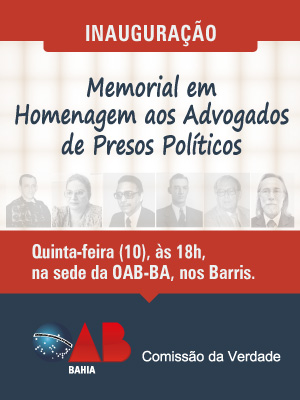 Local: Sede da OAB da Bahia, nos Barris. A OAB da Bahia, através de sua Comissão da Verdade, convida os advogados baianos para a solenidade de inauguração do Memorial em Homenagem aos Advogados de Presos Políticos durante o período da ditadura militar, nesta quinta-feira (10), às 18h, na sede da OAB-BA, nos Barris.