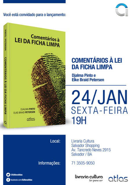 Nesta sexta-feira (24), às 19h, acontece o lançamento do livro "Comentários à Lei da Ficha Limpa", de Djalma Pinto e Elke Braid Petersen, na Livraria Cultura do Salvador Shopping.