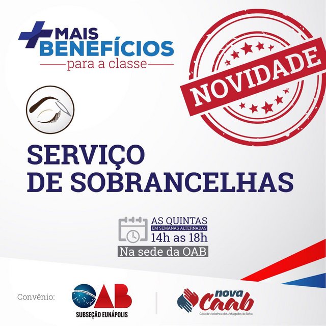 Em recente viagem a Salvador, o Presidente da OAB – Subseção Eunápolis e os representantes da CAAB conseguiram viabilizar o serviço de sobrancelha aumentando o rol de benefícios aos advogados do quadro da Subseção Eunápolis.