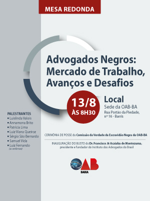 Local: Auditório da OAB da Bahia, na Rua Portão da Piedade. Na próxima quinta-feira (13), às 8h30, a OAB da Bahia, por intermédio da Comissão Especial de Promoção da Igualdade Racial, presidida pela advogada Dandara Pinho, promove a mesa redonda 'Advogados negros: mercado de trabalho, avanços e desafios'. O evento, que integra a Semana do Advogado da OAB-BA, acontece no auditório da seccional e tem como palestrantes Luiz Viana Queiroz, Luislinda Valois, Patricia Lima, Anhamona Brito, Luiz Fernando, Sergio São Bernardo e Samuel Vida.