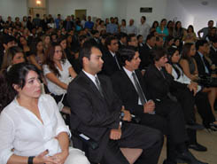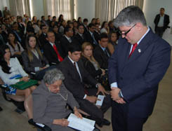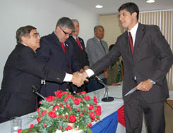 Por ter obtido a maior nota no Exame de Ordem da turma presente, Alan Francisco Reis Souza foi quem leu o Termo de Compromisso do Advogado. Depois a palavra foi dada ao Paraninfo da turma, representante da Ordem no TRE, Maurício Kertzman Szporer, que, após saudar os novos Advogados, afirmou que a escolha pelo curso de Direito oferece pleno conhecimento para se exercer uma vida cidadã. "A advocacia é encantadora e estimulante. O profissional do Direito não é burocrata. Ele cria o Direito. Não se conforma com as primeiras impressões que o Direito lhe dá. Quebra paradigmas. A defesa destemida é sua obrigação". (leia o discurso na íntegra)