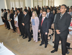 A OAB-BA realizou, na tarde desta quinta-feira (12), na sede da Seccional, solenidade de entrega de carteiras da Ordem, para 76 estagiários. O Vice-Presidente, Antônio Menezes, fez a abertura do evento, saudando a todos e, em seguida, passou a palavra ao Paraninfo da turma, o advogado e professor Augusto Vasconcelos. O professor discorreu sobre a importância do momento de estagiar. "Esse é um momento de extrema importância, pois o estagiário também é parte indispensável para o bom andamento da Justiça. Os mais novos, em virtude do acesso às novas tecnologias, acabam tendo muitas informações, o que tem contribuído para a horizontalização do conhecimento". Para ele, o estagiário também deve buscar soluções e dar o melhor de si, já que também está vivendo um momento de aprendizagem do ponto de vista humano. "Por trás de cada ação, existem pessoas. Esses interesses são muito importantes para quem nos contratou". O Paraninfo defendeu ainda que esse também deve servir como momento de reflexão sobre a situação em que passa o Direito na atualidade. "Vocês vão encontrar um Judiciário com muitas dificuldades e a OAB tem feito esse alerta sobre a Justiça Estadual", acrescentou. O Vice-Presidente comentou as palavras do Paraninfo, e destacou a importância do estudo e leitura de livros. "Afinal o advogado trabalha com a palavra". Ele disse ainda que estamos longe da igualdade, na prática. "Veja o quanto o Brasil se bateu para aprovar as cotas raciais. Não basta apenas a norma, mas fazer com que se efetive a igualdade". Menezes citou também o episódio que ocorreu com o advogado, Murilo Azevedo, que foi agredido com um soco no rosto, pela Promotora Cleide Ramos Reis, durante a audiência realizada na última segunda-feira (9), no Fórum Odilon Santos, em Santo Amaro da Purificação. Logo em seguida, o Vice-Presidente deu início à entrega das carteiras. Compuseram a Mesa Alta, além do Vice-Presidente e do Paraninfo, o Ouvidor-Geral, Manoel Gomes Machado Bisneto, e os advogados Vilebaldo Magalhães Setúbal Filho, Eliasibe Simões, Eliodi de Fátima Antunes da Silva e Jeferson Braga.