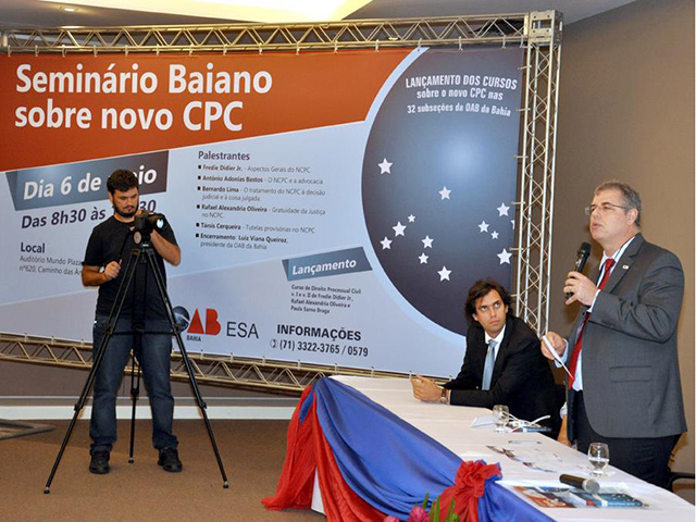 Na oportunidade, foram lançados, também, os cursos sobre o novo CPC na capital e nas 32 subseções da OAB, no interior, que serão ministrados pela ESA, além do livro “Curso de Direito Processual Civil”, dos professores Fredie Didier, Rafael Alexandria e Paula Sarno Braga. O seminário foi transmitido ao vivo pela internet no site da OAB da Bahia e teve uma audiência on-line de 1.788 pessoas.