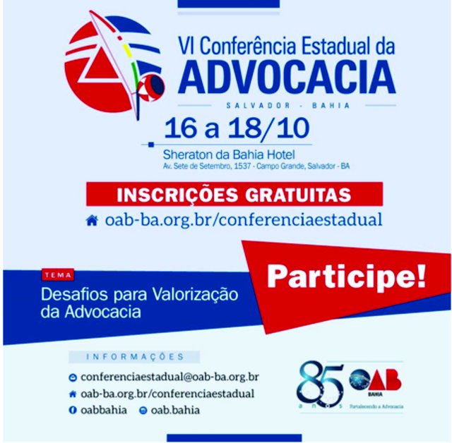 A Conferência, que é trienal, acontece entre os dias 16 e 18 de outubro deste ano, no Sheraton da Bahia Hotel, no Campo Grande em Salvador, tendo dentre os palestrantes o conceituado Fredie Didier, sendo que as inscrições são gratuitas.