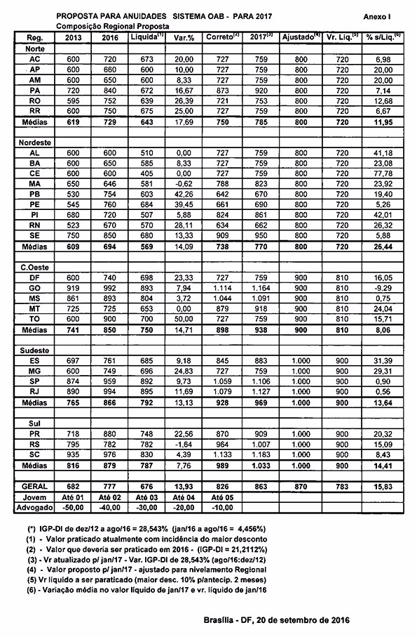 Valor mínimo regional - A recomposição do valor da anuidade da OAB-BA segue o plano do CFOAB de nivelamento regional, com valores coerentes com cada região do país. Assim, o valor proposto para as regiões Norte e Nordeste é de R$ 800, para Centro-Oeste de R$ 900, e de R$ 1000 para Sudeste e Sul. Economia - Importante destacar que a anuidade da OAB da Bahia estava congelada há três anos em R$ 650, o valor mínimo recomendado pelo Colégio Nacional de Presidentes de Seccionais em 29 de novembro de 2013, no Rio de Janeiro. A OAB-BA adotou este valor mínimo, que é o segundo menor do país, e o manteve inalterado em 2014, 2015 e 2016, apesar da inflação e das reposições salariais dos funcionários, entre outras despesas. Deste modo, ao decidir não aplicar a atualização monetária no valor da anuidade entre 2014 e 2016, a OAB-BA proporcionou aos advogados e advogadas uma economia real durante os três últimos anos.