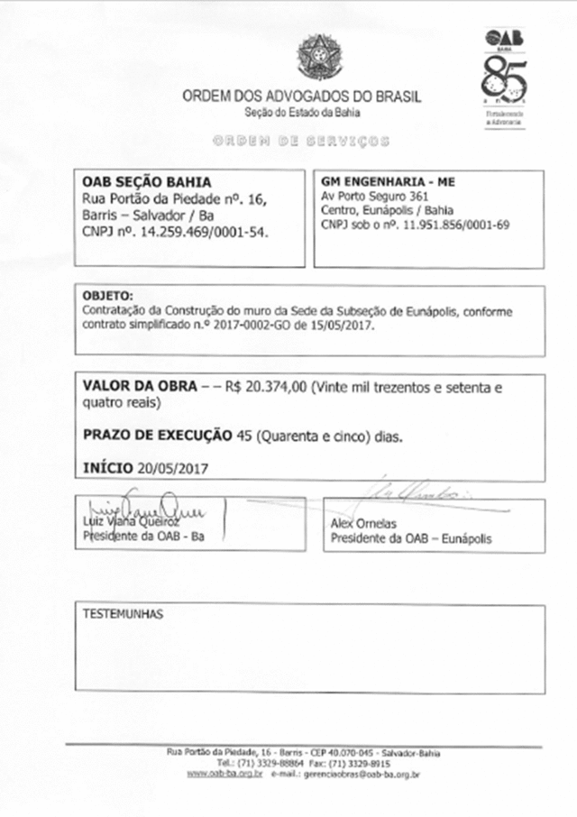 No dia 16 de maio do corrente ano, o Presidente da OAB – Seção Bahia (Luiz Viana) em reunião com Alex Ornelas em Salvador atendeu ao pleito da Subseção Eunápolis e expediu Ordem de Serviço autorizando a construção imediata do muro.