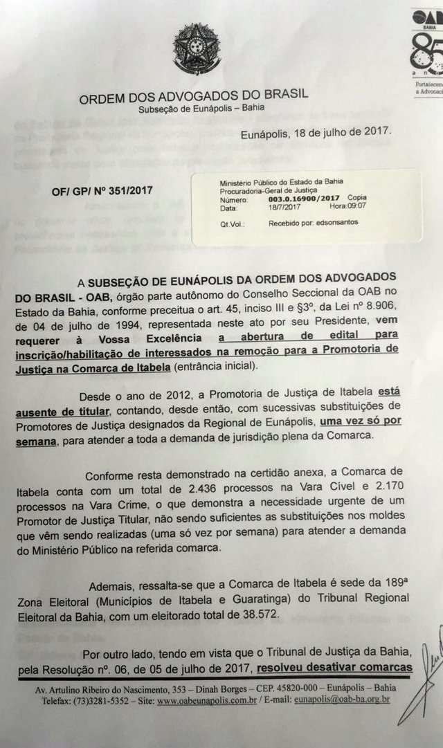 OAB - Subseção Eunápolis solicita designação de promotores titulares para as comarcas de Itabela e Guaratinga