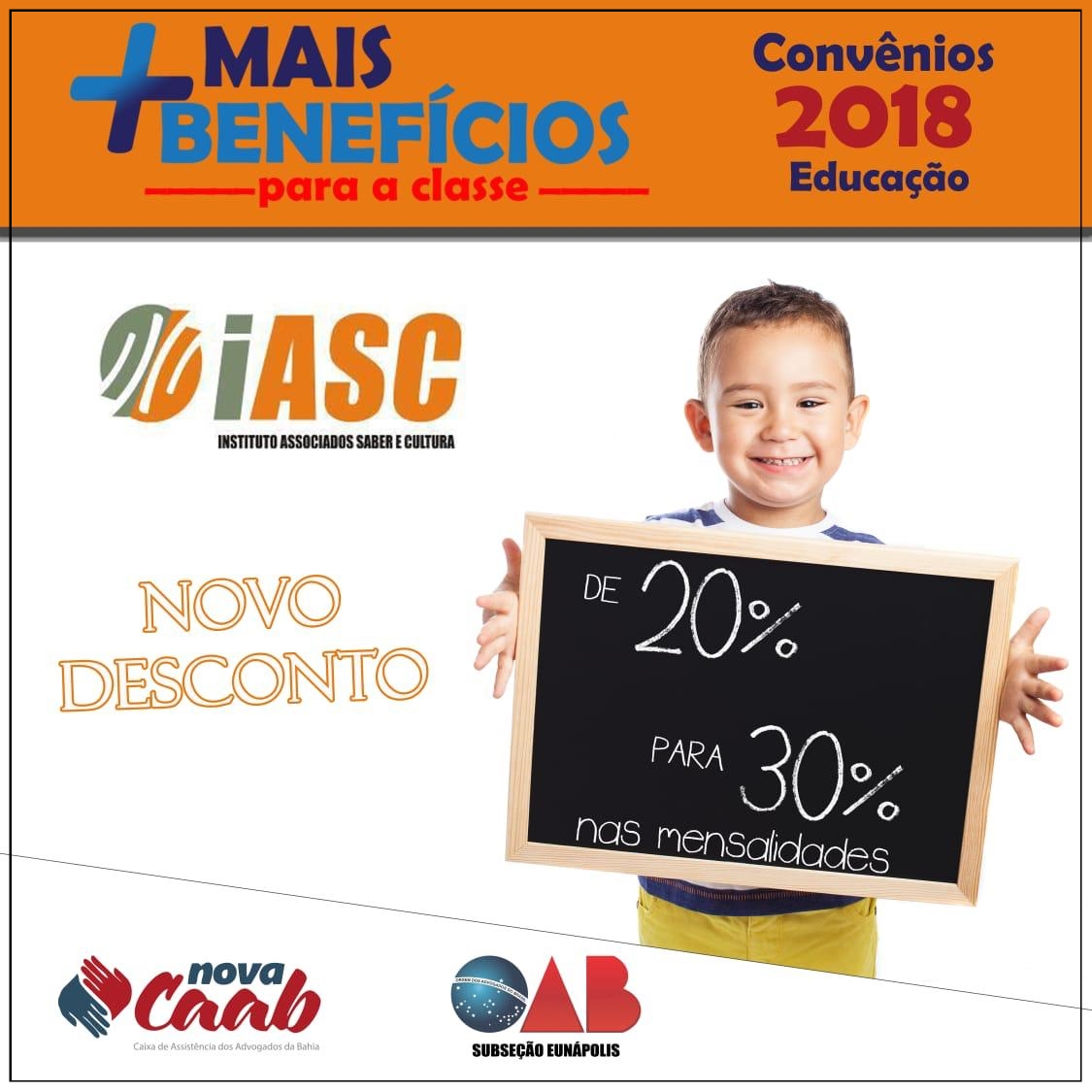 Nessa perspectiva, foi assinado novo contrato que tem por objeto a majoração do percentual de desconto (de 20% para 30%) incidentes nas mensalidades do Colégio IASC.