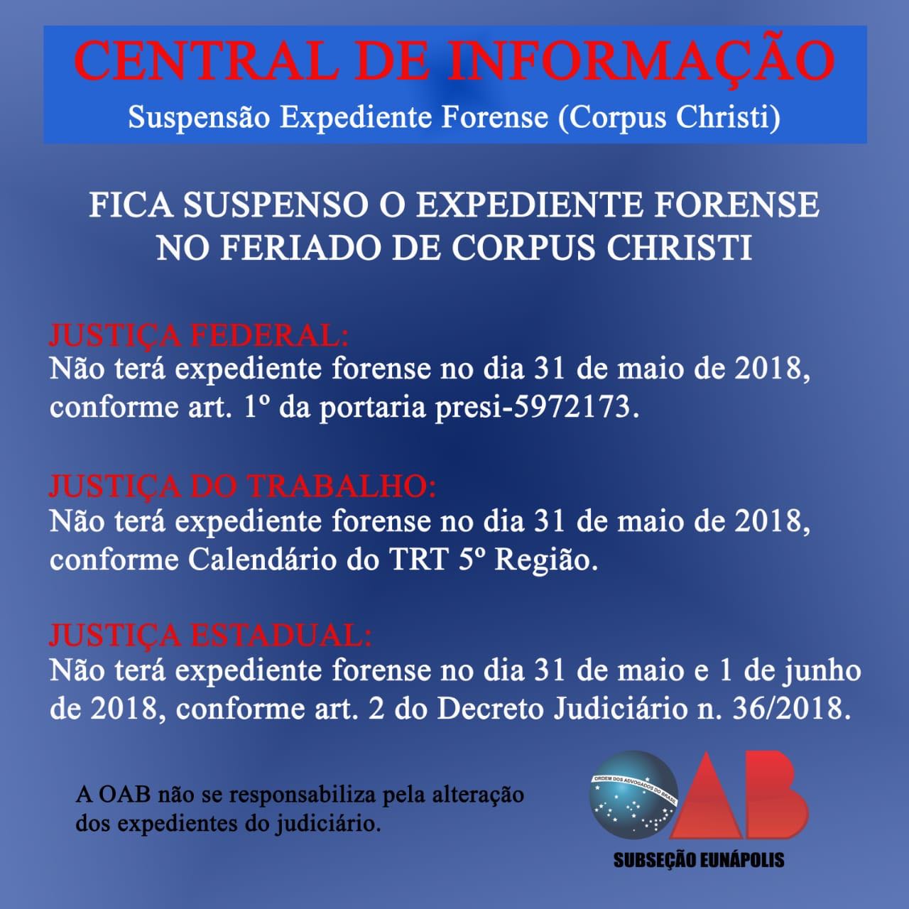 A OAB - Subseção Eunápolis, através da Central de Informação e Monitoramento referente a suspensão do expediente forense, vem, nos termos dos documentos oficiais, informar sobre o feriado de Corpus Christi (31/05).