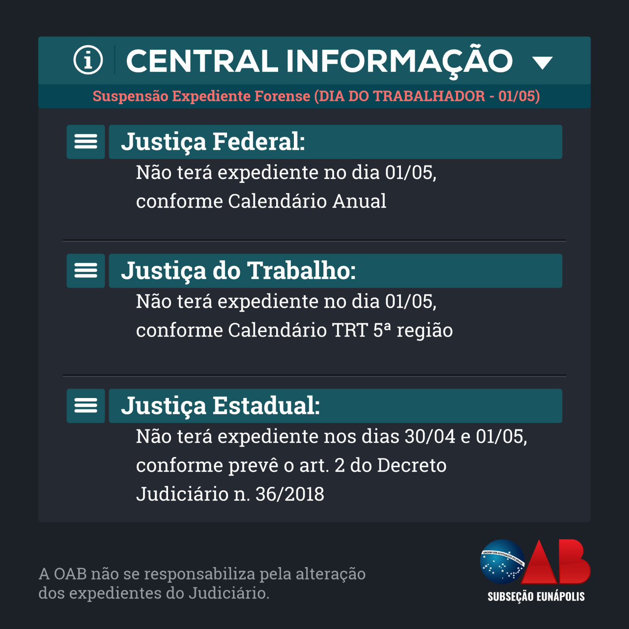 OAB/Eunápolis: Central de Informação Suspensão de Expediente Forense Feriado do Dia do Trabalhador