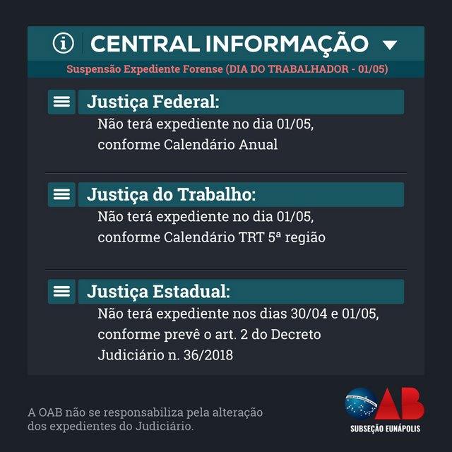 A OAB - Subseção Eunápolis, através da Central de Informação e Monitoramento referente a suspensão do expediente forense, vem, nos termos dos documentos oficiais, informar sobre o feriado do Dia do Trabalhador (01/05).