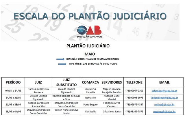 OAB/EUNÁPOLIS: Escala de Plantão Judiciário foi extraído do site do TJ/BA - maio/2018