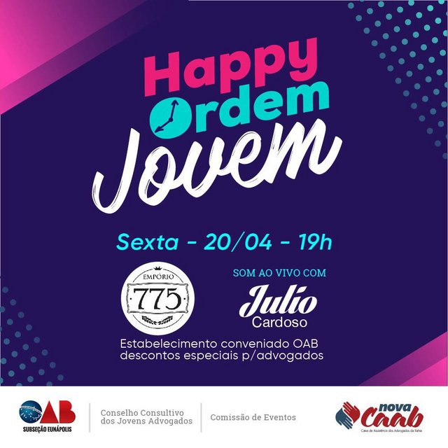 A OAB/Eunápolis, através do Conselho Consultivo dos Jovens Advogados, realizará na sexta-feira (20/04), às 19 horas, mais uma edição do Happy Ordem.