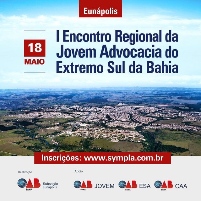 No dia 18 de maio, a Jovem Advocacia baiana se reunirá, no centro de convenções do Hotel Portonápolis, em Eunápolis - BA, para o I Encontro Regional da Jovem Advocacia do Extremo Sul da Bahia, onde serão discutidos temas de grande importância para os advogados e advogadas em início de carreira.