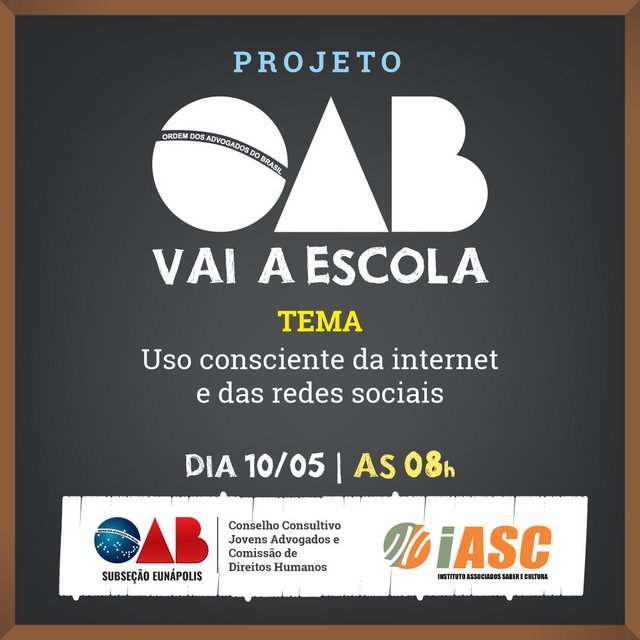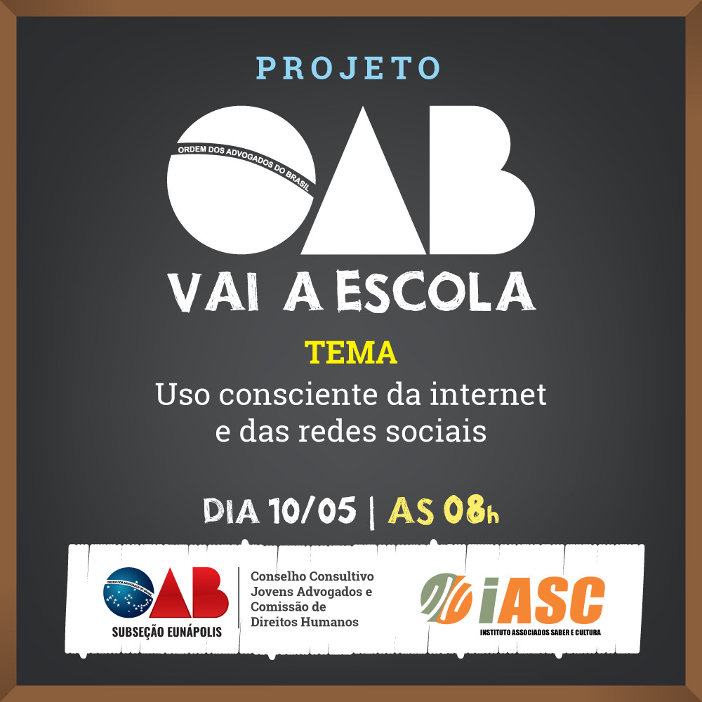 A OAB - Subseção Eunápolis, através da Comissão de Direitos Humanos, cumprindo o cronograma institucional de visitas às escolas da rede pública e privada, estará desenvolvendo o projeto “OAB Vai à Escola”, nos dias 10 e 11 de maio, na escola IASC - Instituto Associado Saber e Cultura.