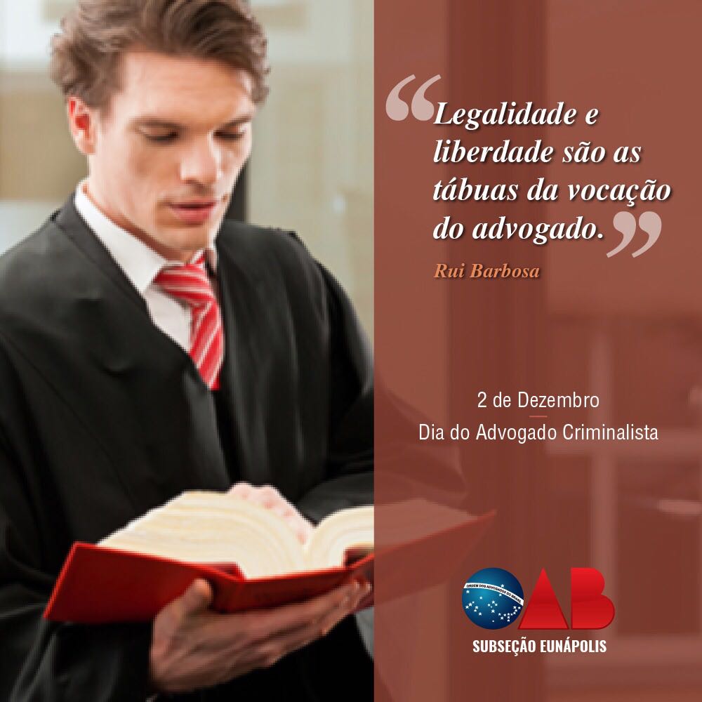 Neste ato, a Ordem dos Advogados do Brasil, Subseção Eunápolis/BA, parabeniza os aguerridos profissionais que atuam nesta área do Direito, ressaltando que o Advogado Criminalista não defende o ilícito penal, não defende o criminoso, mas sim defende o Direito; a Justiça e a correta aplicação da Lei.